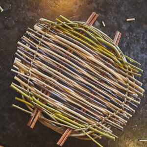 Amanda’s inspiration for her weaving comes from the wonderful colours she grows and harvest and as the willow dries the colours change and mellow, every variety has its own subtle qualities. She loves to combine this with driftwood she finds on the beach and from the shapes of branches fallen in the woods. Some of her favourite techniques you see here are fitching where 2 strands of willow are woven alternately as a single band in the middle of a basket- this looks simple but takes practise and skill to get it right and it’s lovely to take the rods around again to create a chain-link effect.