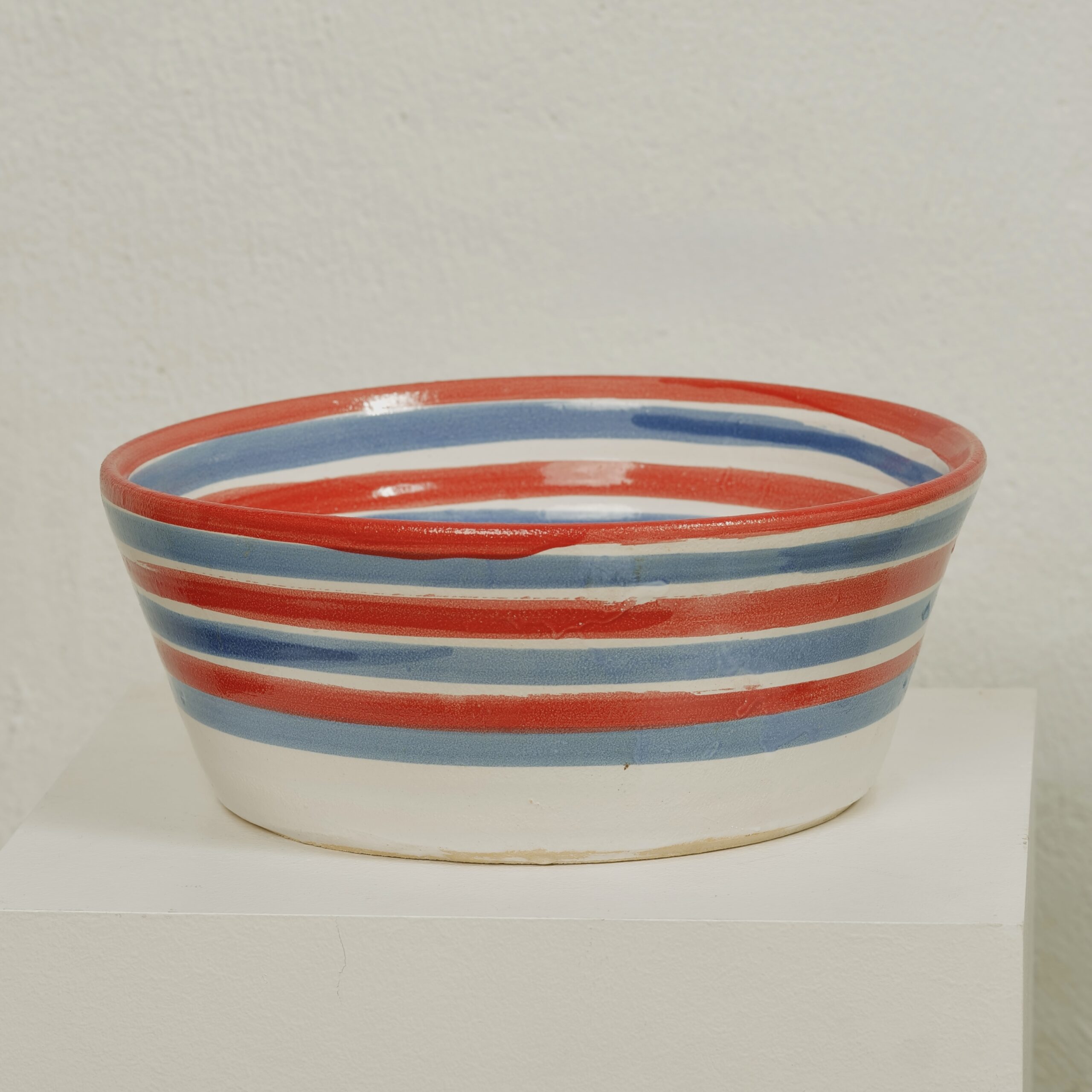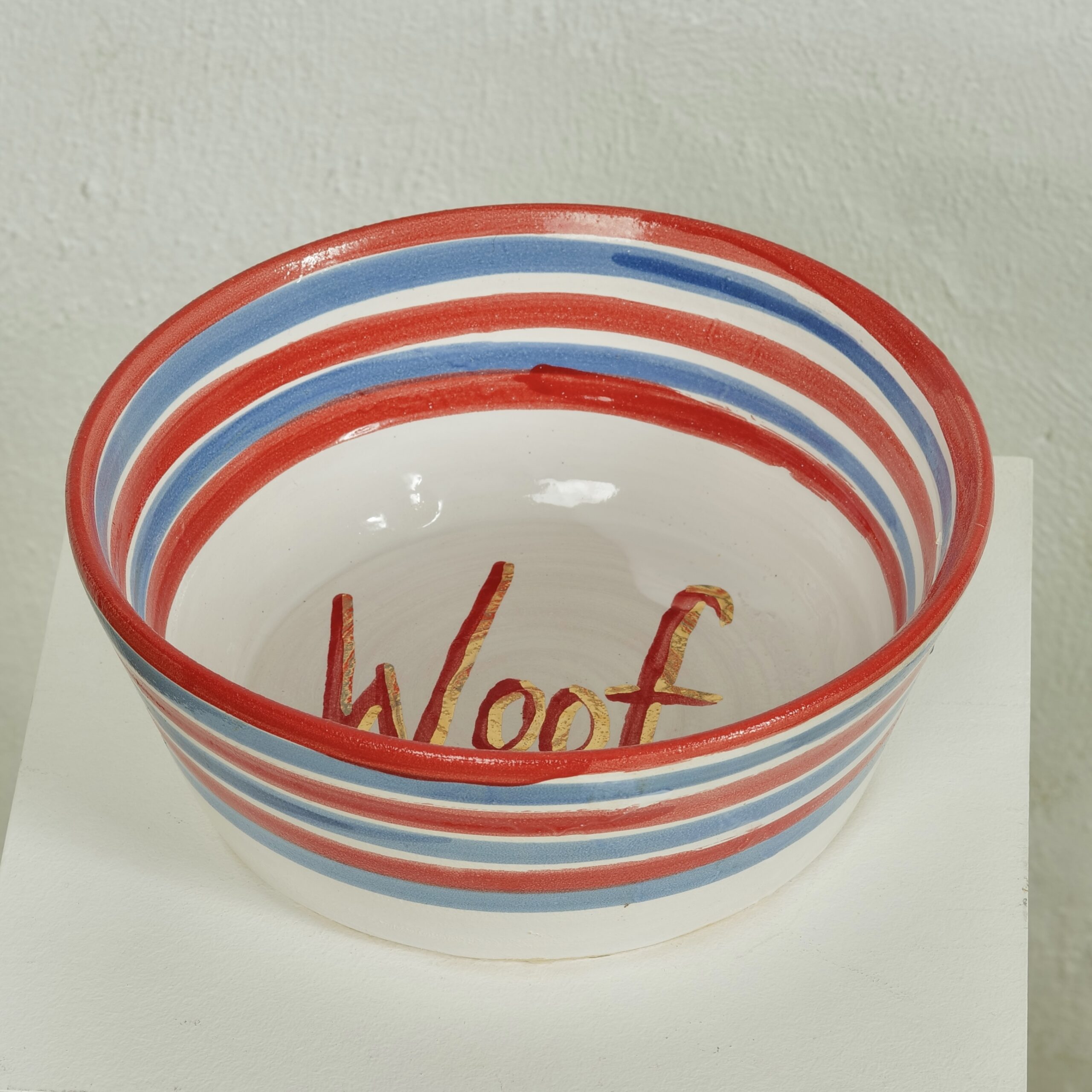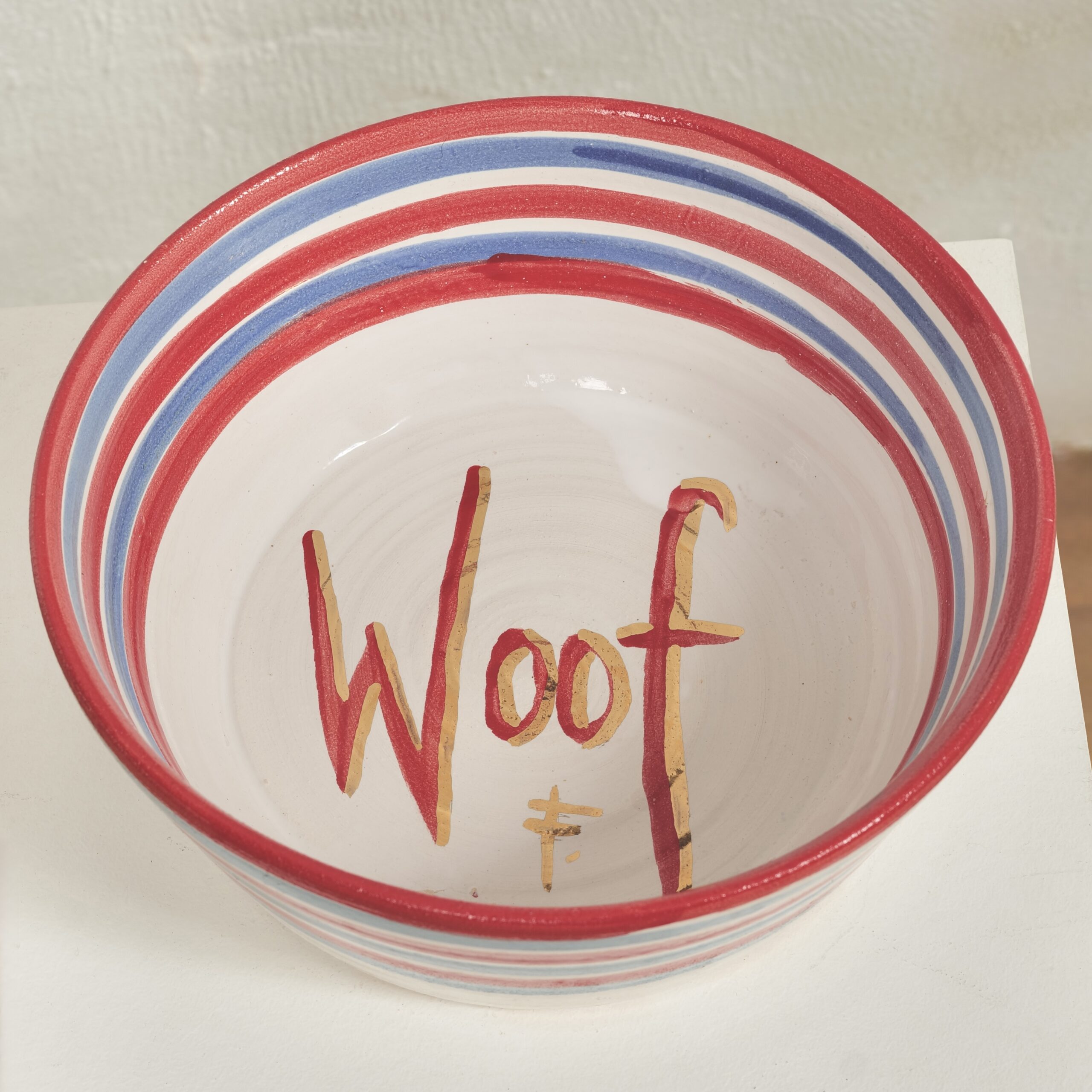 A hand-thrown ceramic dog bowl with cheerful red and blue stripes. Each one can be personalised with your dog’s name or the word “Woof” painted inside.