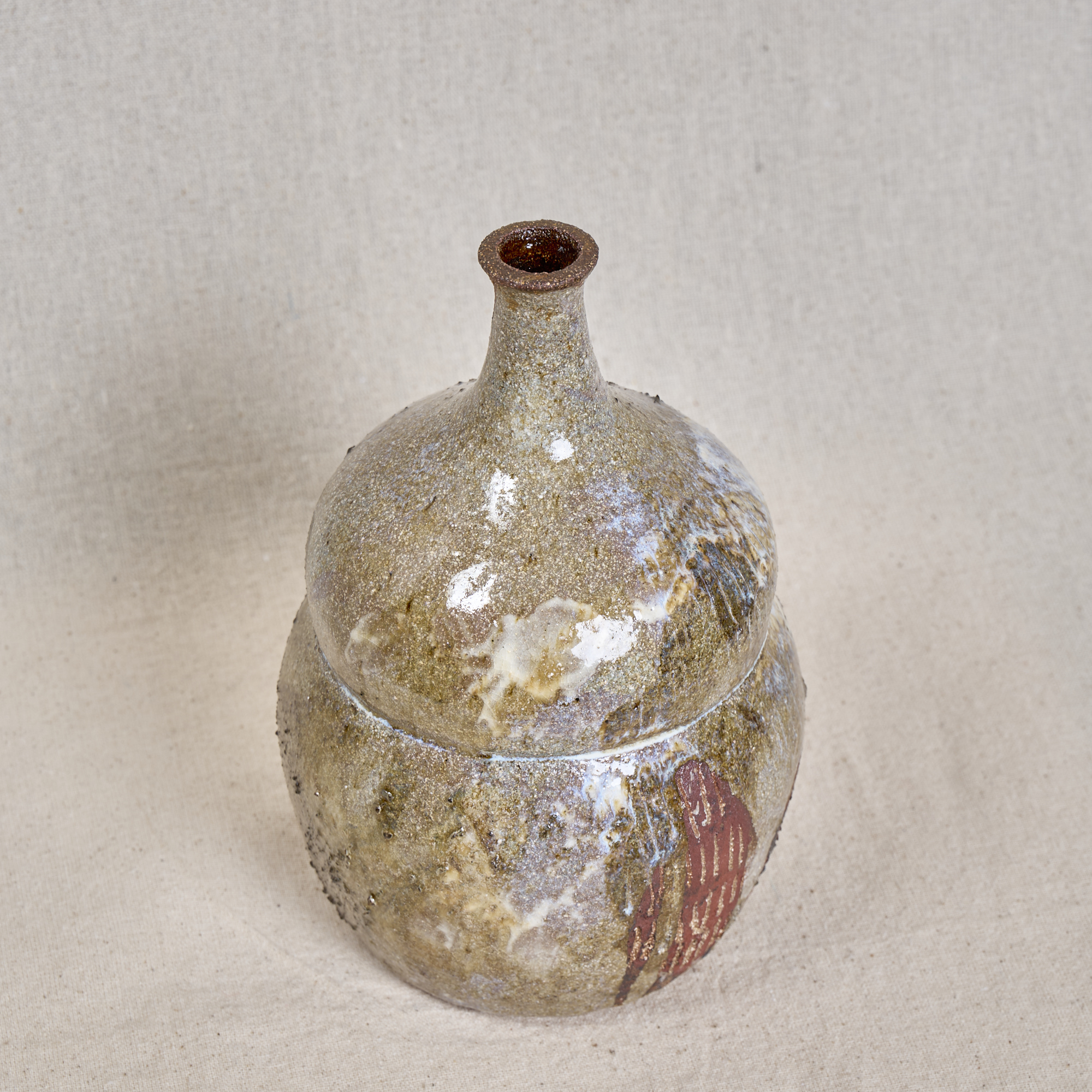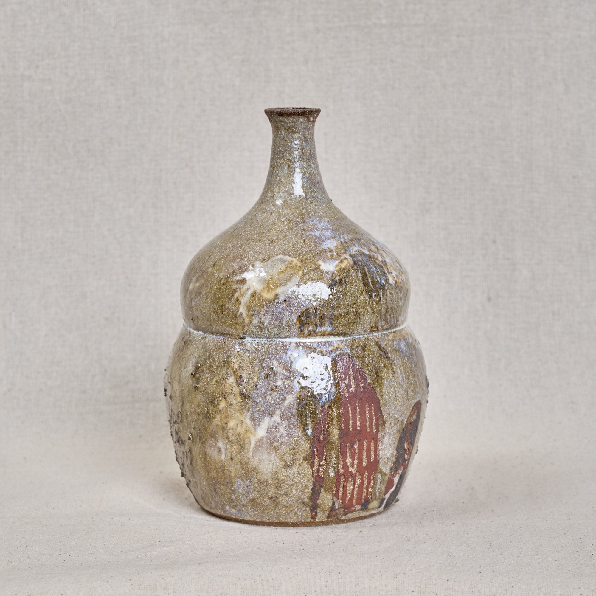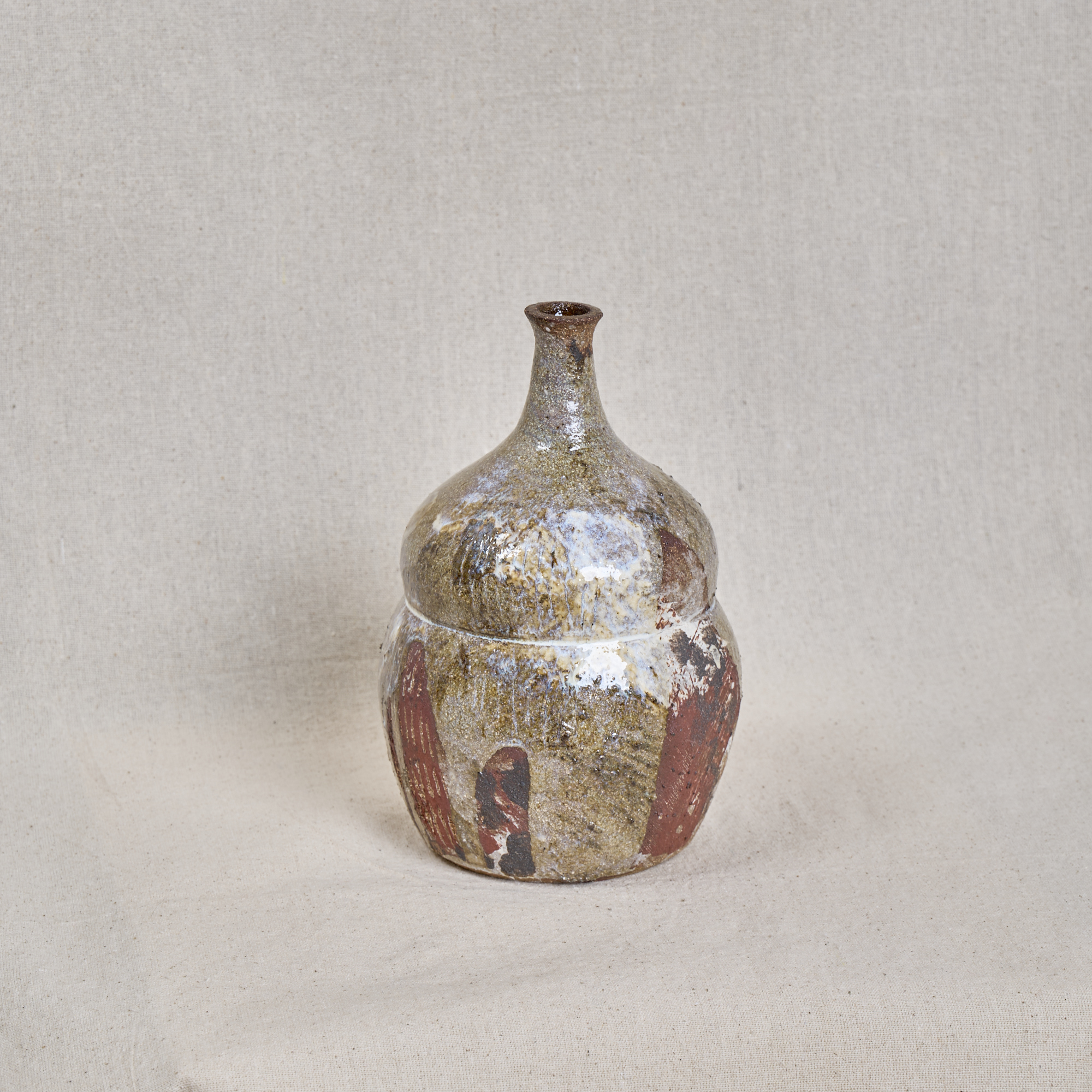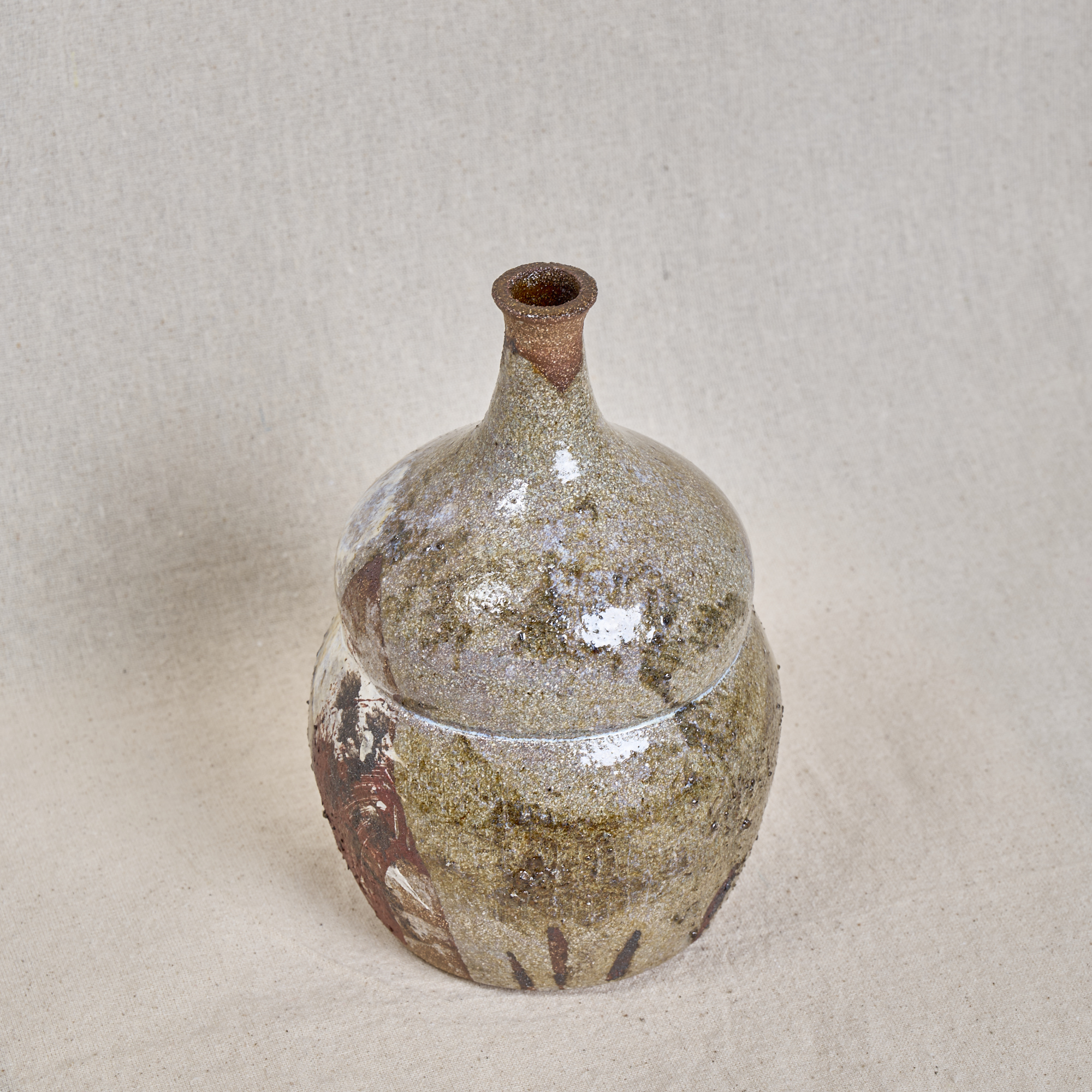 A hand-thrown stoneware bottle with a softly rounded form and narrow neck, finished with a richly textured glaze. Layers of earthy tones and exposed pink grog clay create a tactile, expressive surface.