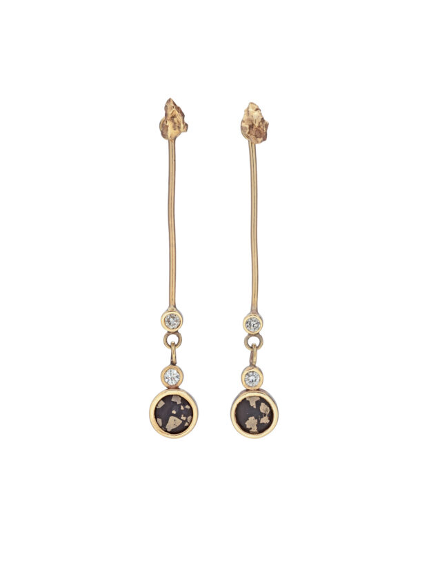 Philippa works with traditional metal-forming techniques, transforming raw materials into elegant, wearable jewellery. Her Stellar collection, for example, features simple geometric shapes such as circular discs of stone, often contrasted with raw details like nuggets of gold. She favours pared-back designs that allow the materials themselves to shine, ensuring each piece feels both enduring and contemporary across changing fashions.