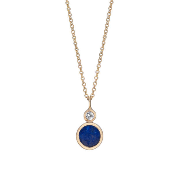 Handcrafted pendant set with a disc of celestial looking Lapis Lazuli and a brilliant white diamond.