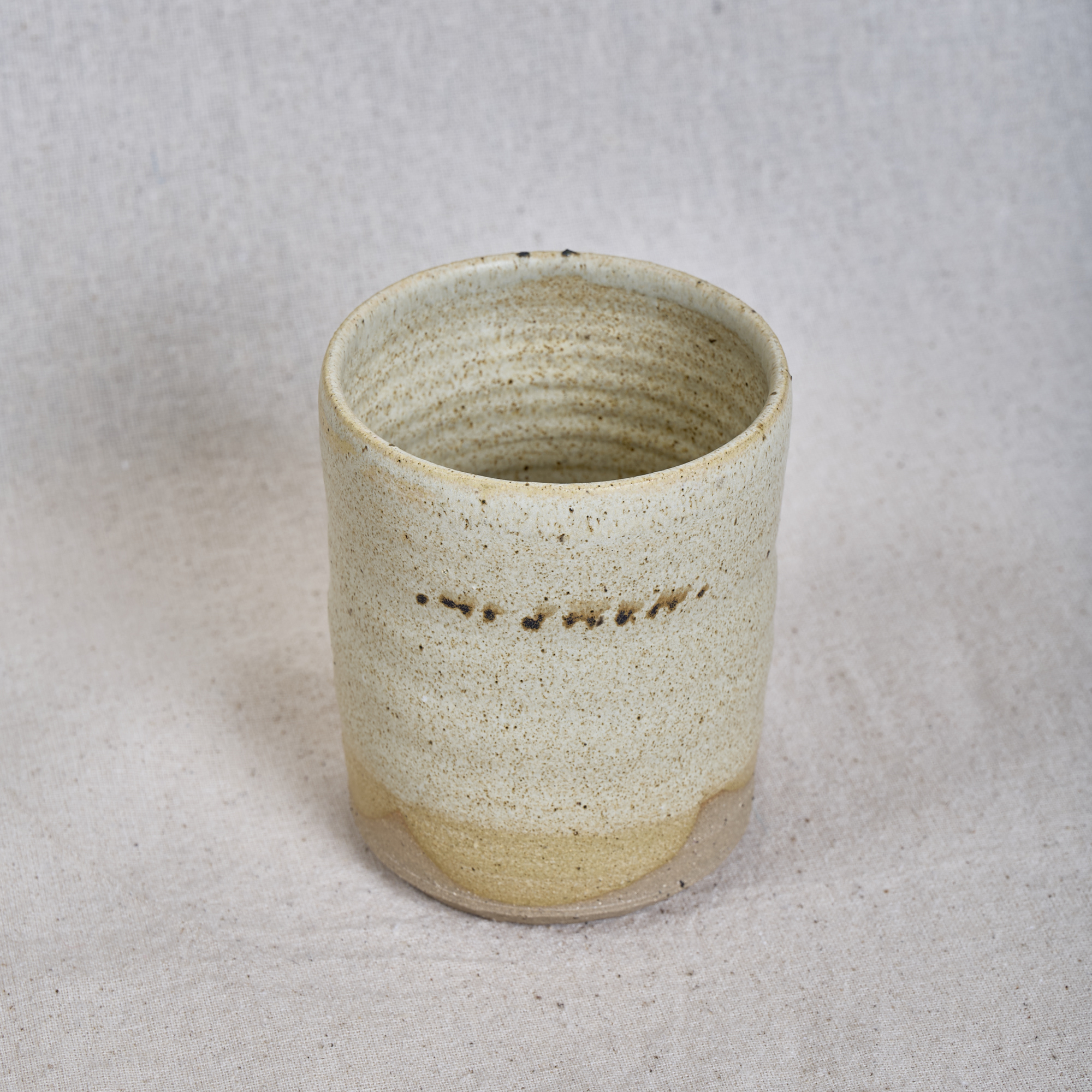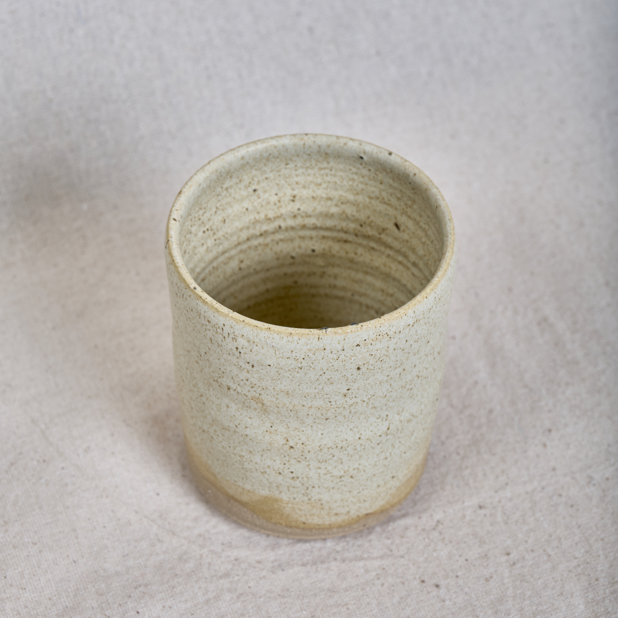A softly textured stoneware hug cup with a warm, sandy glaze and subtle speckling, offering a calm and natural feel in the hand.