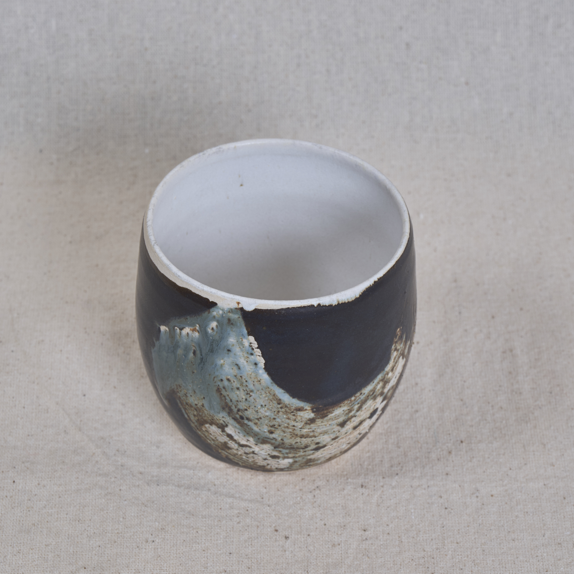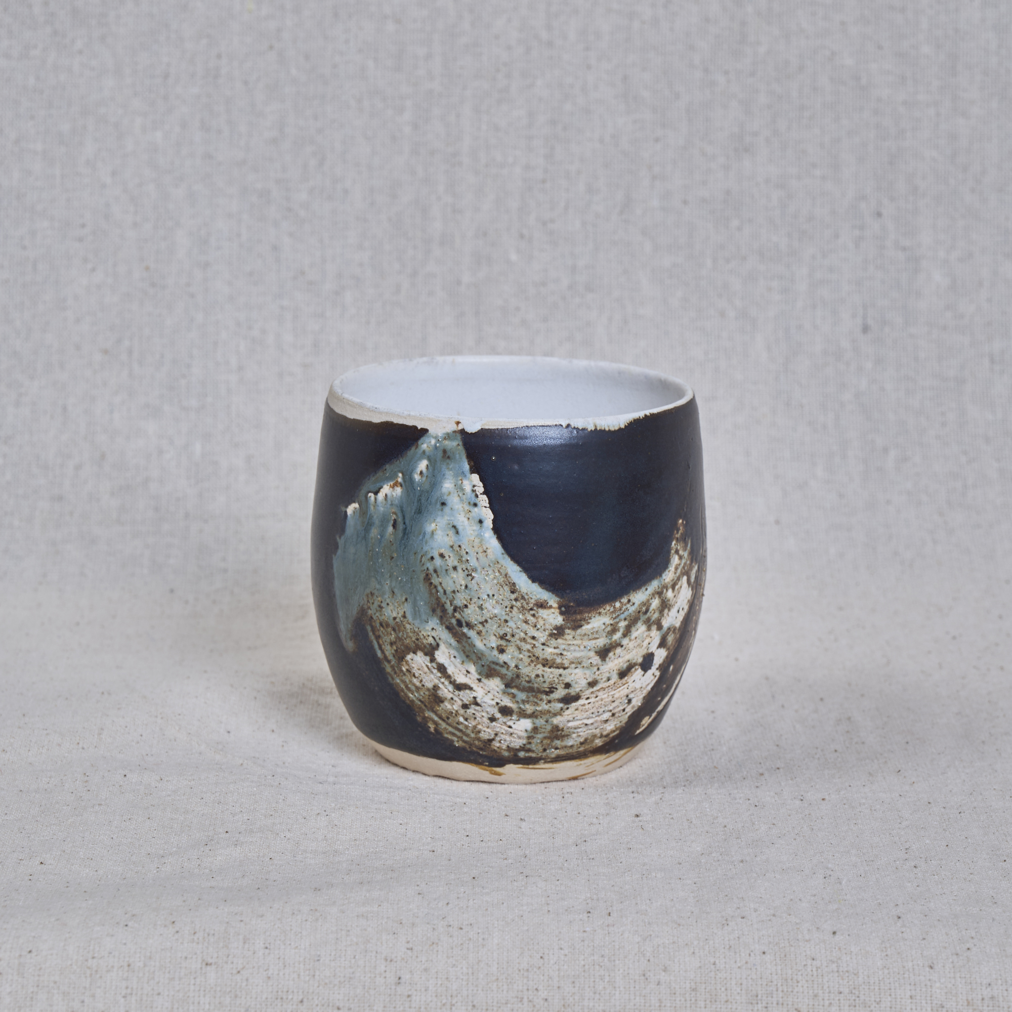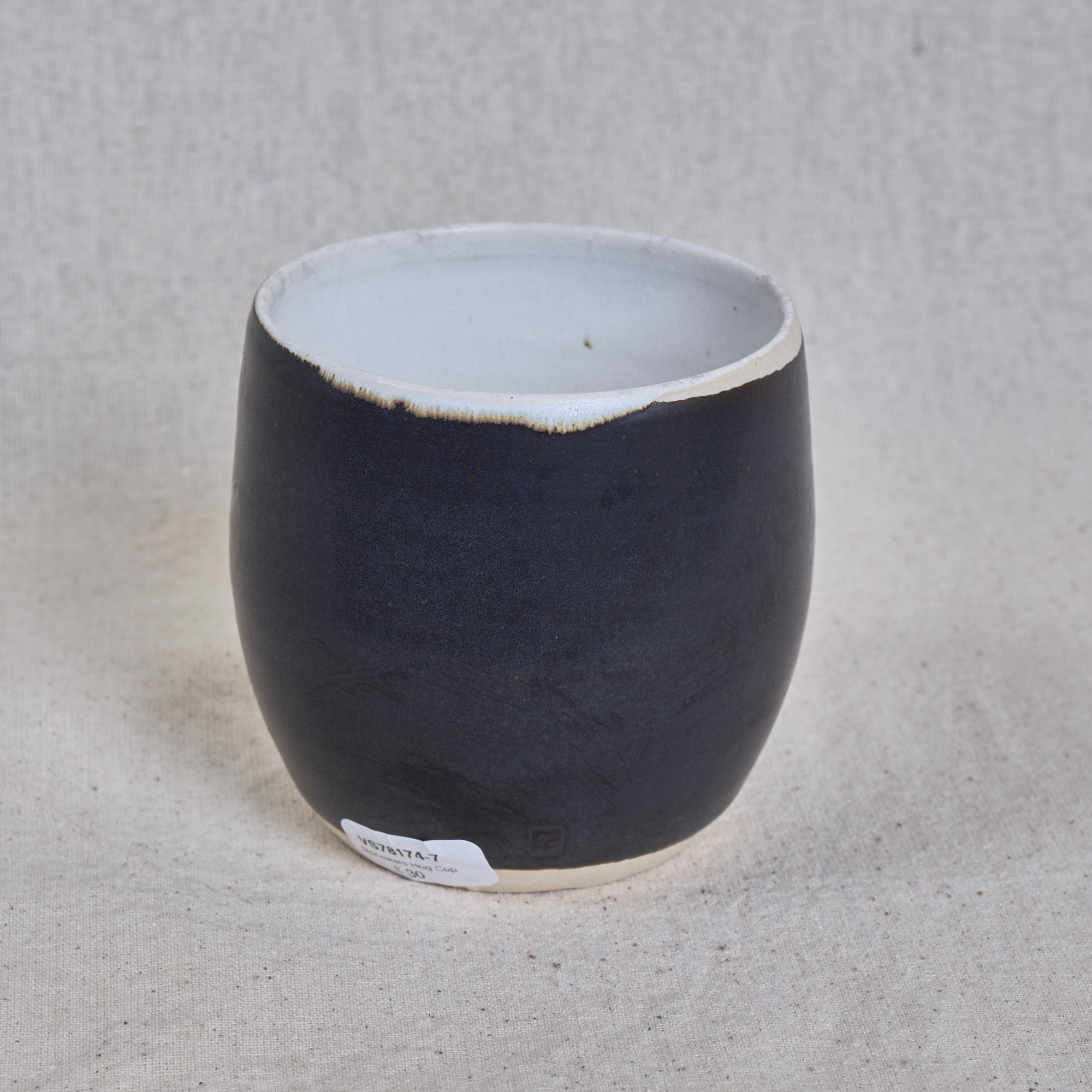 A rounded stoneware hug cup with a deep dark glaze and sweeping brush detail, contrasted by a soft, light interior.