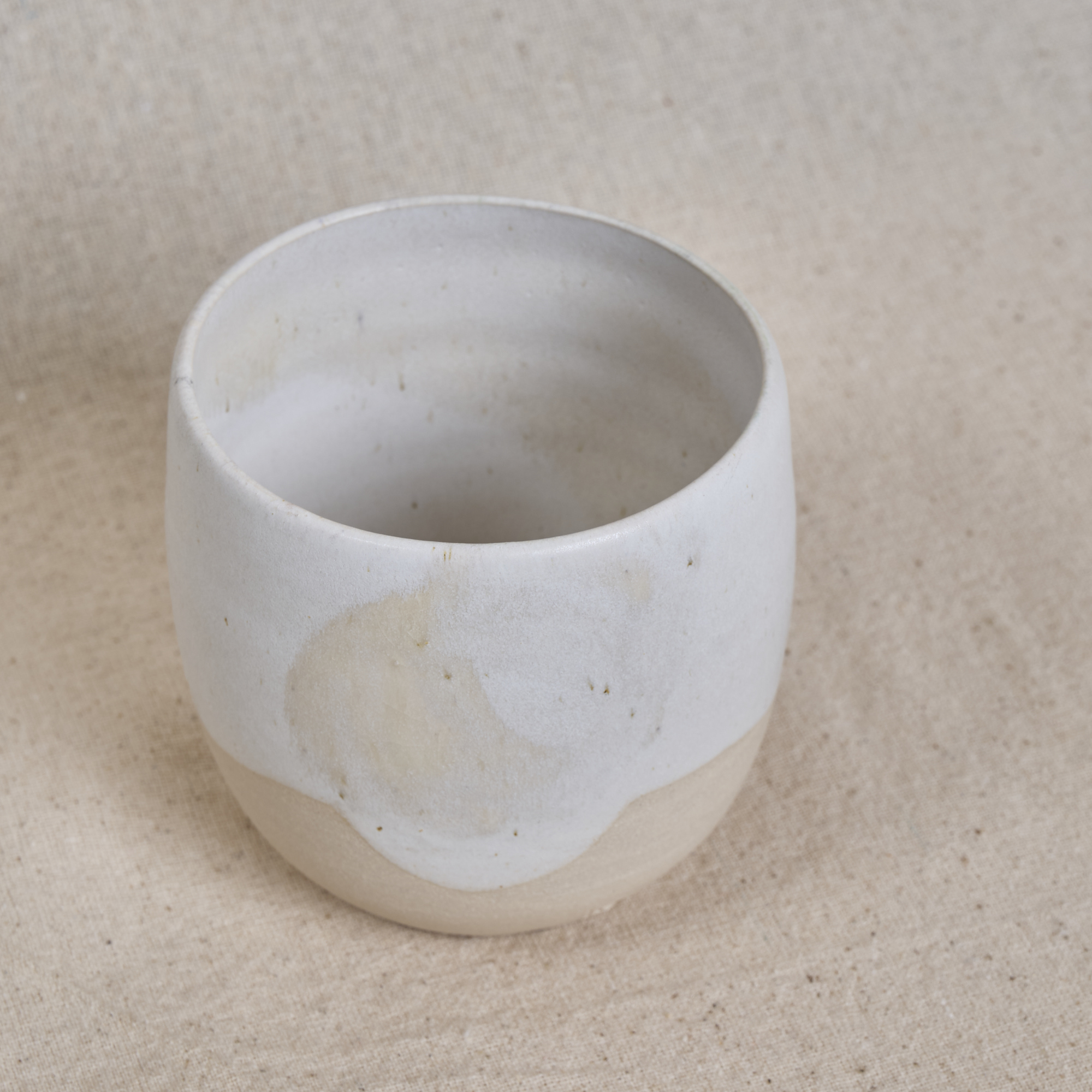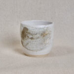 A soft, rounded stoneware cup with a pale glaze and natural clay base, offering a calm and understated feel.