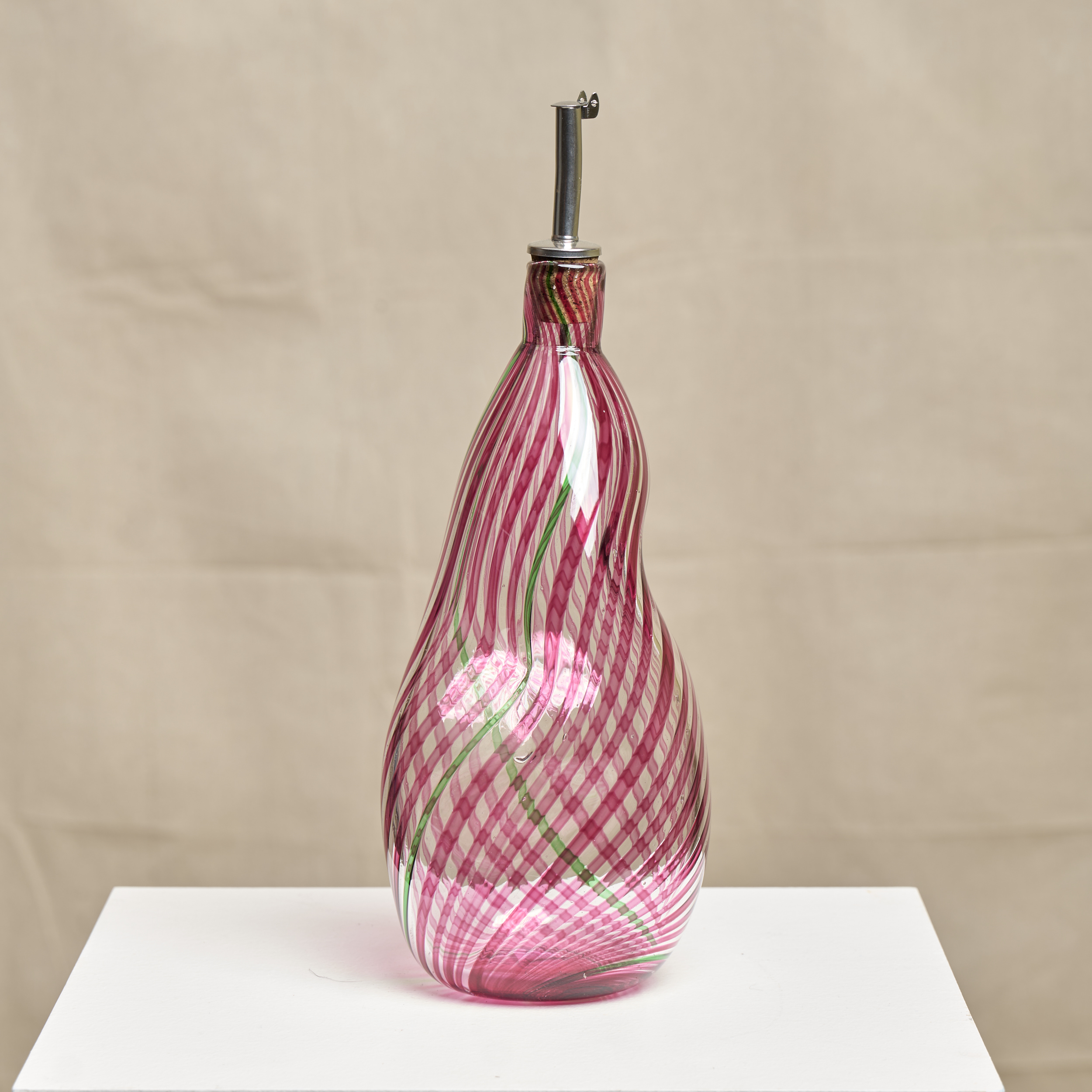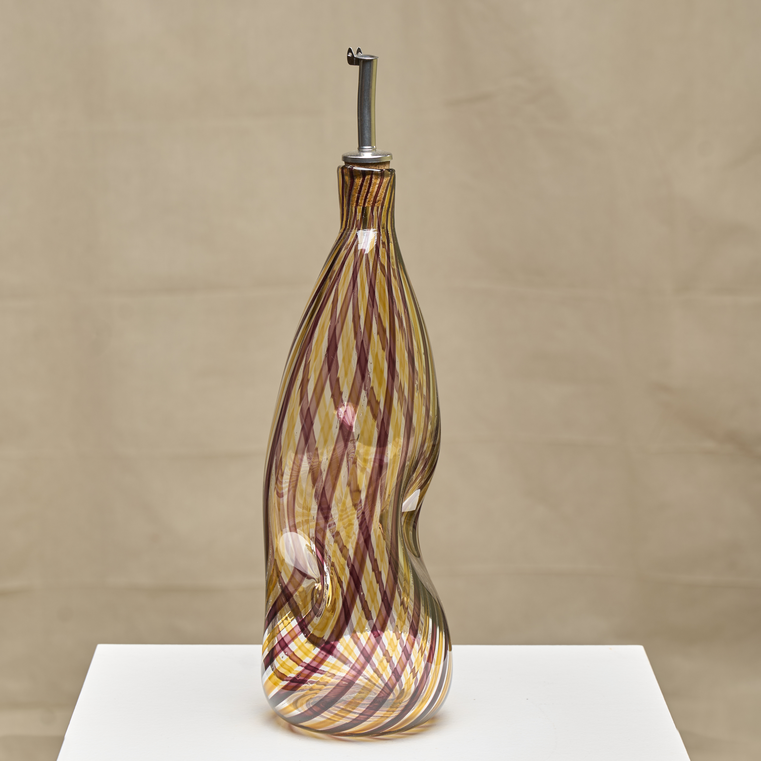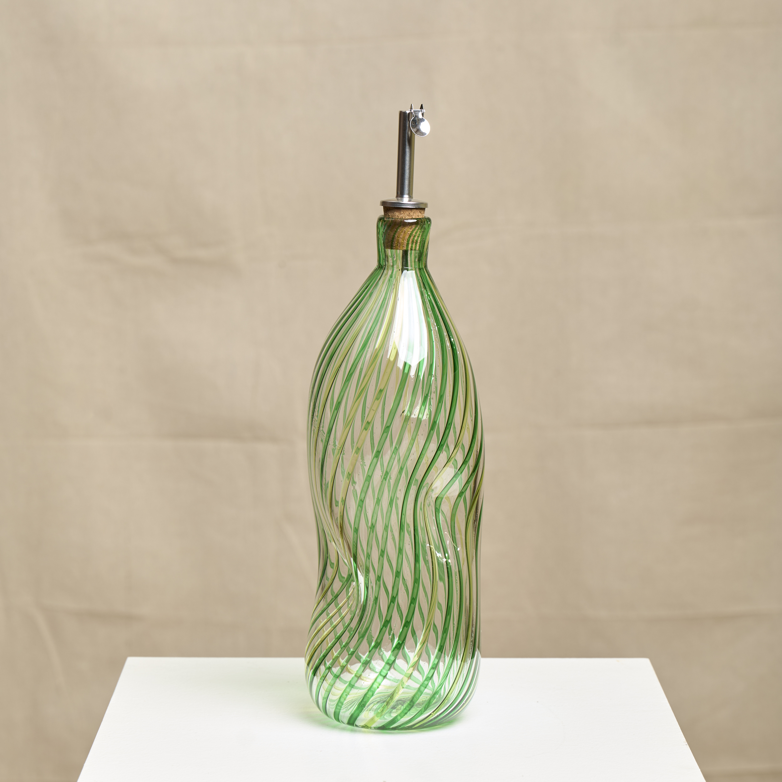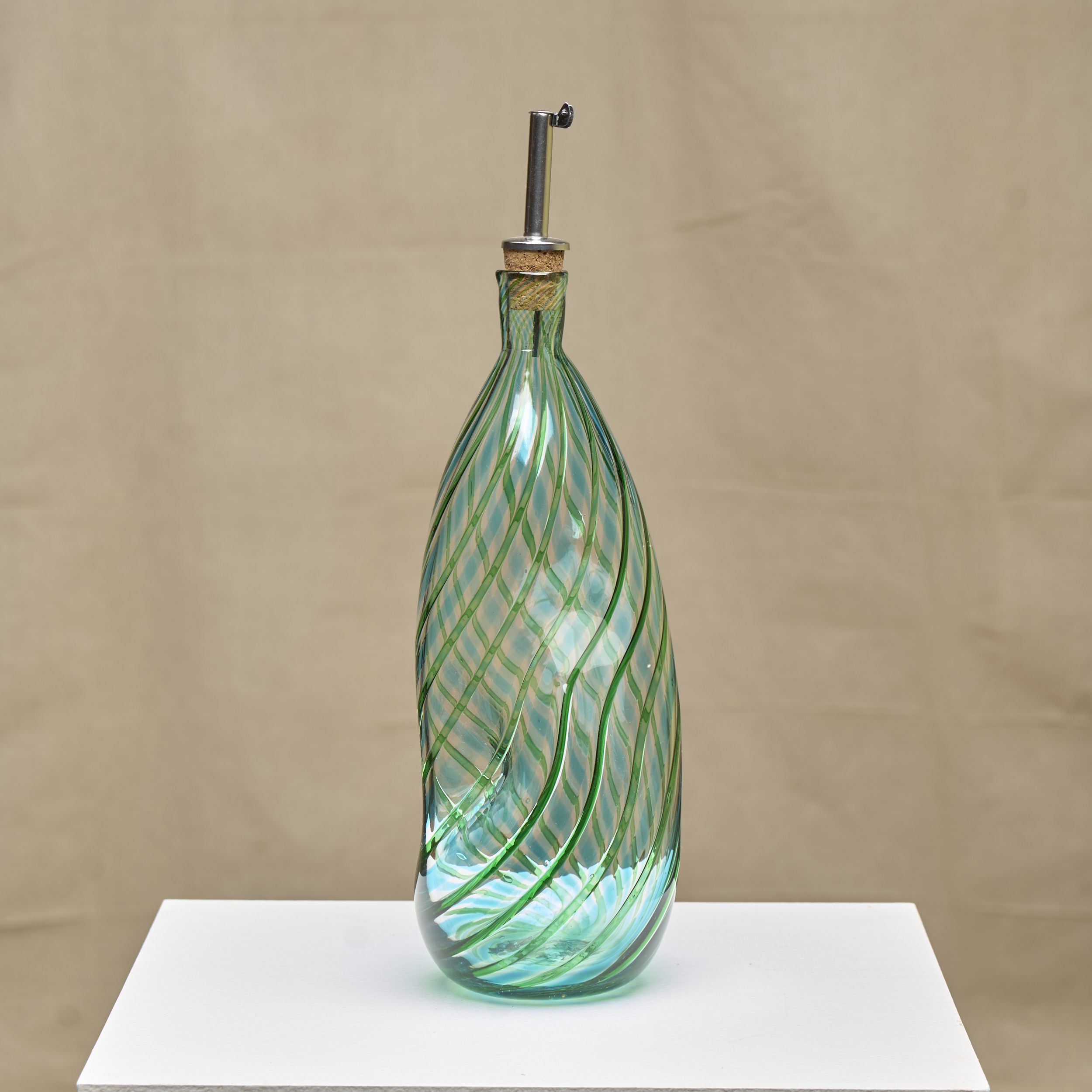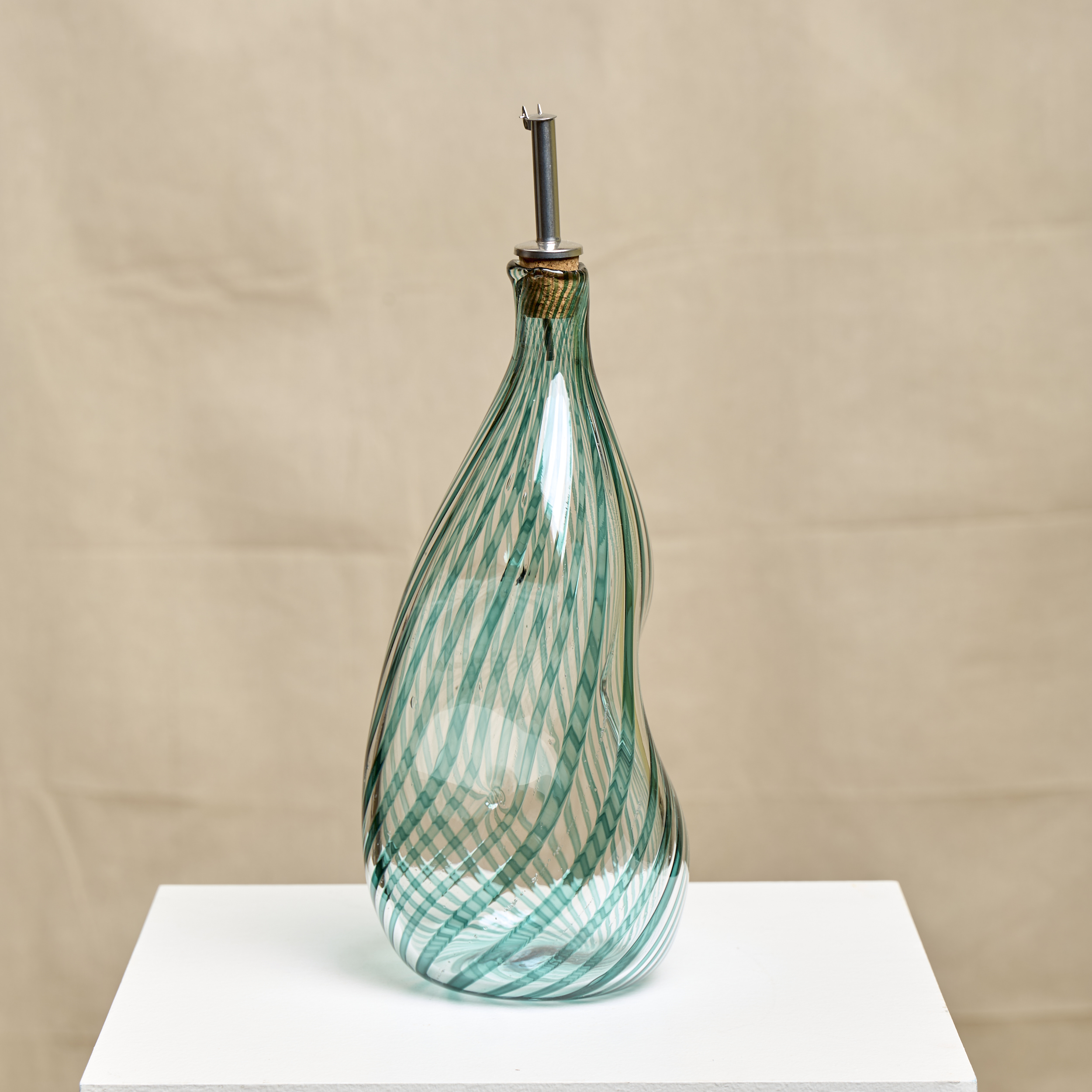 A handblown glass oil bottle with elegant striped detailing and a stainless-steel pourer. Each piece is individually formed, giving it a graceful, sculptural shape.