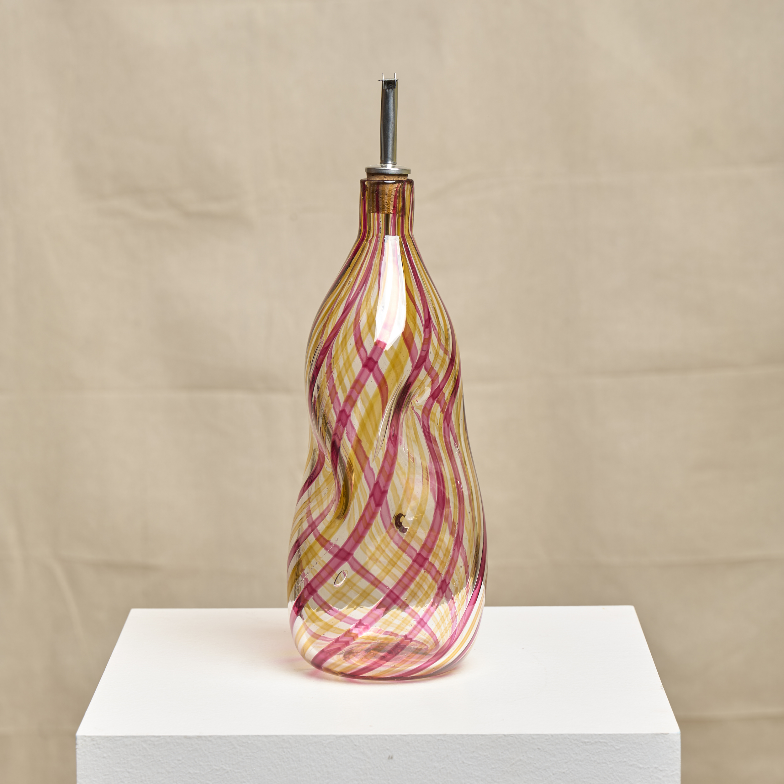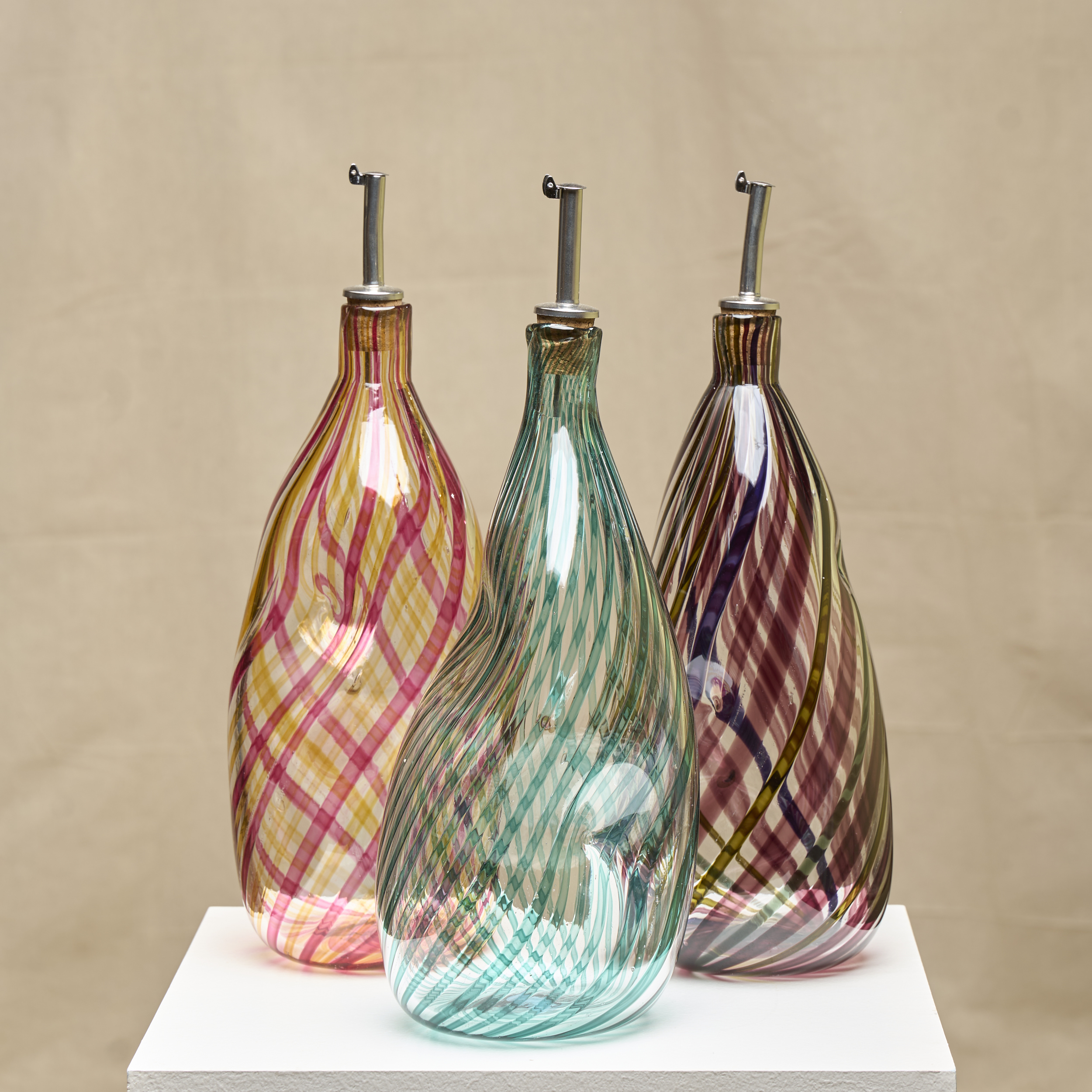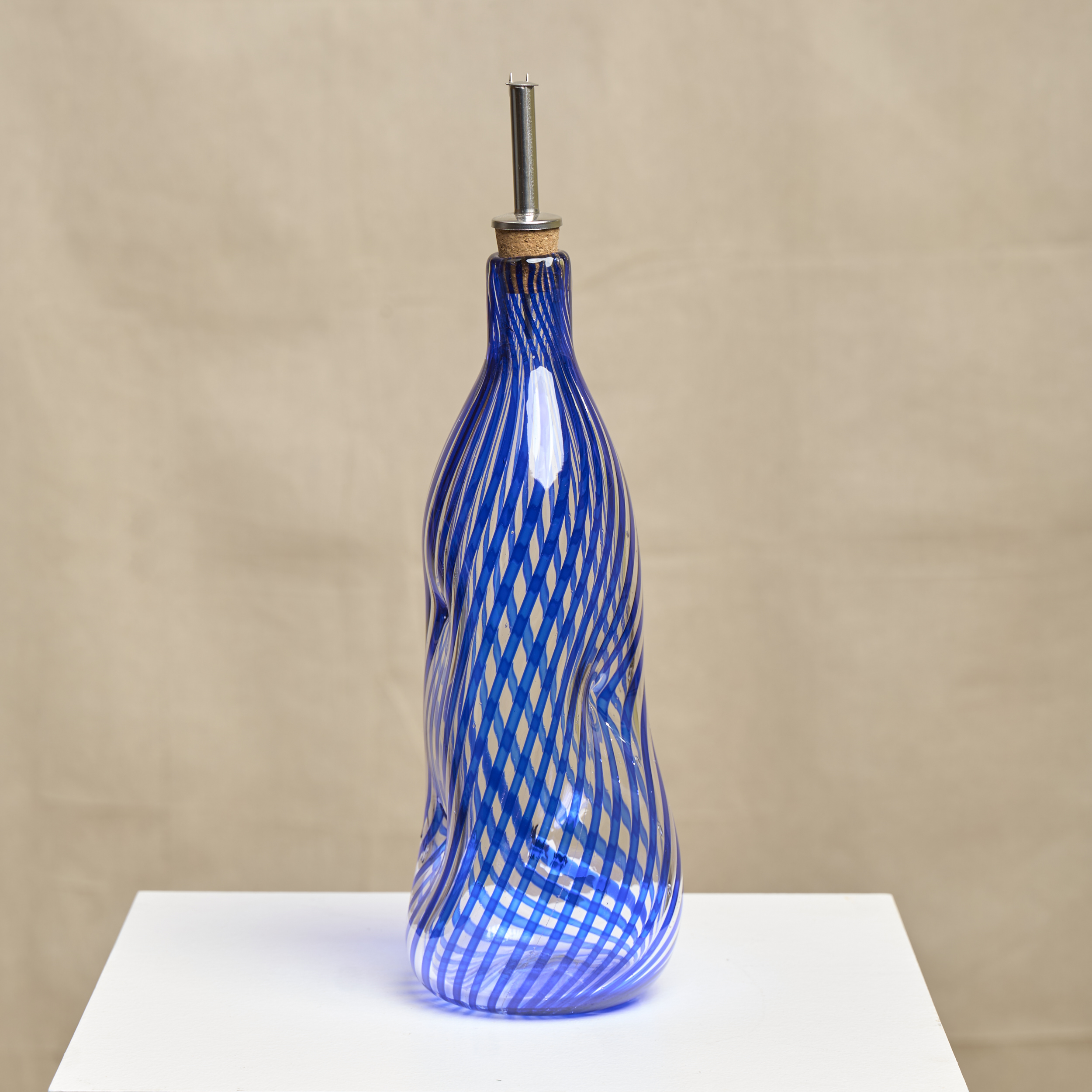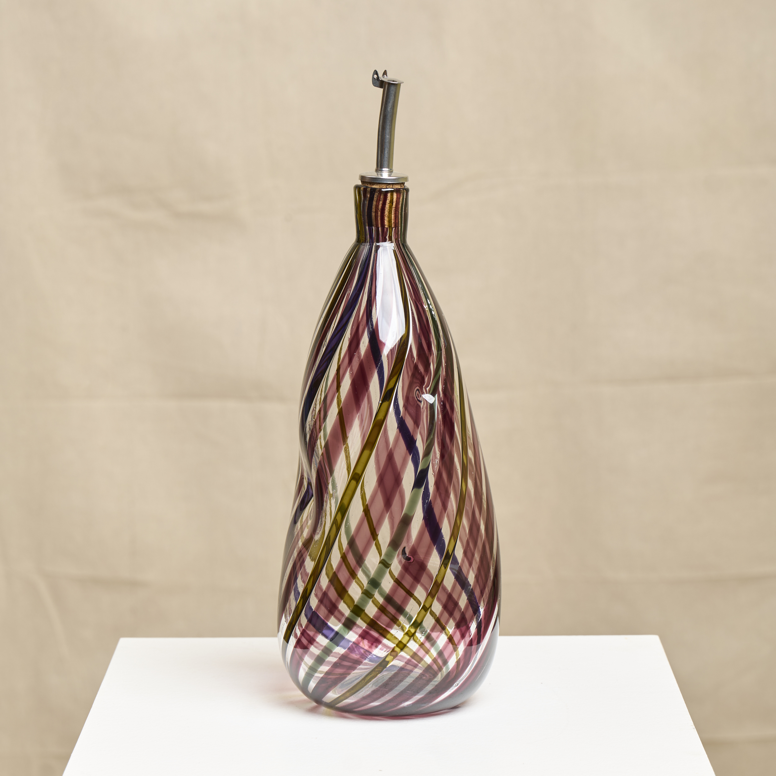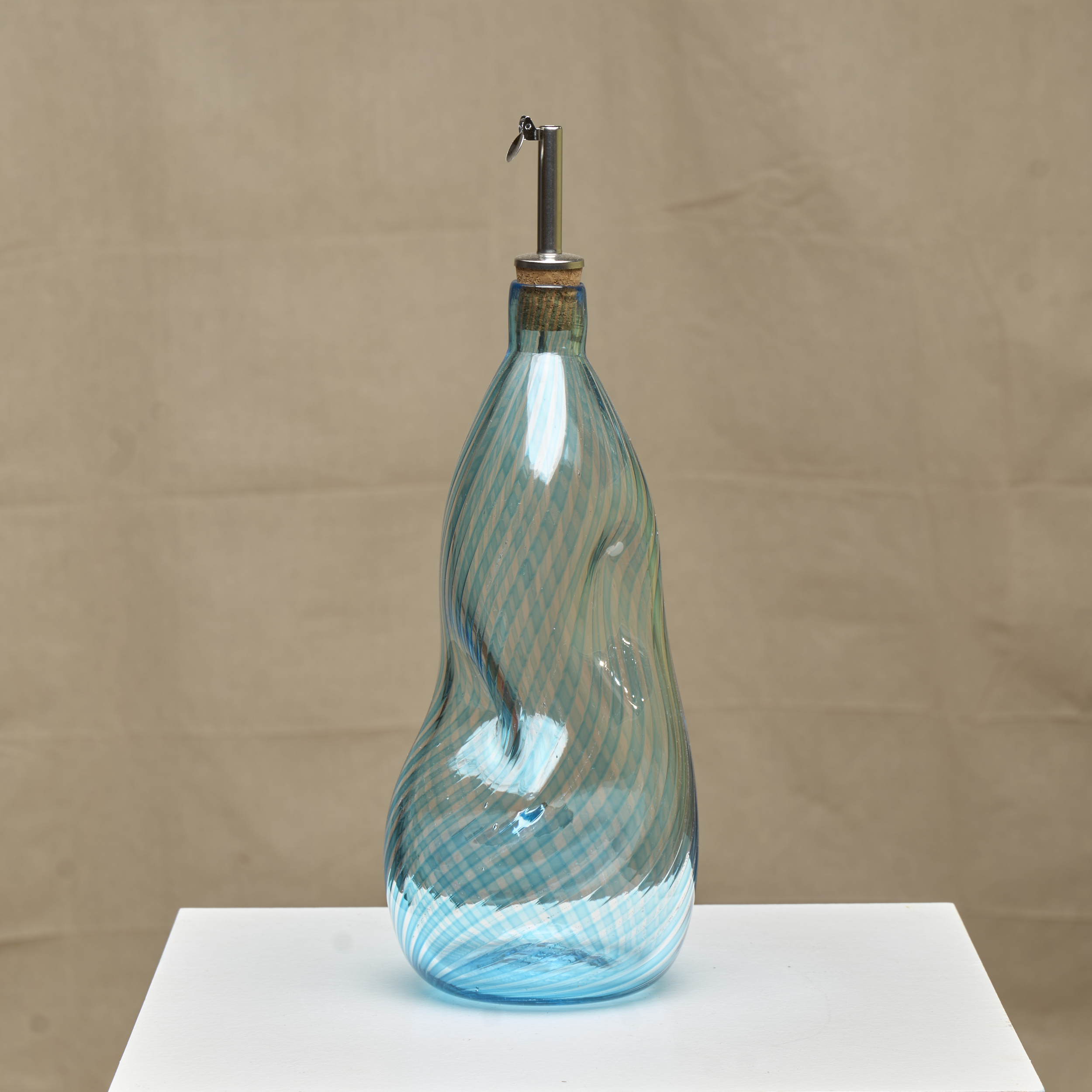 A handblown glass oil bottle with elegant striped detailing and a stainless-steel pourer. Each piece is individually formed, giving it a graceful, sculptural shape.