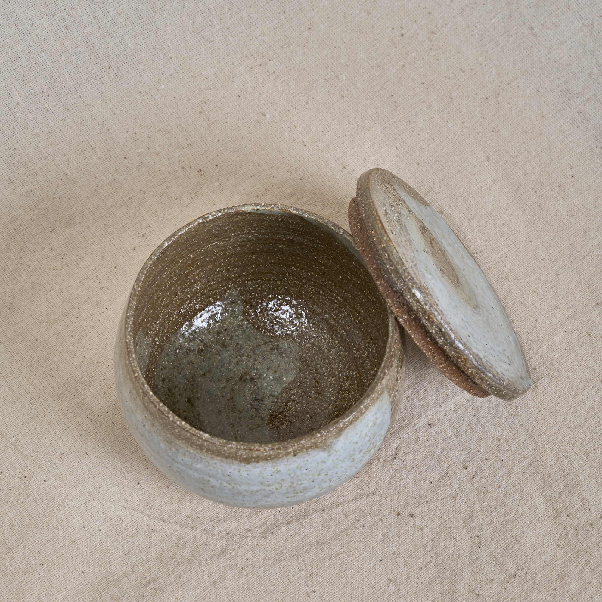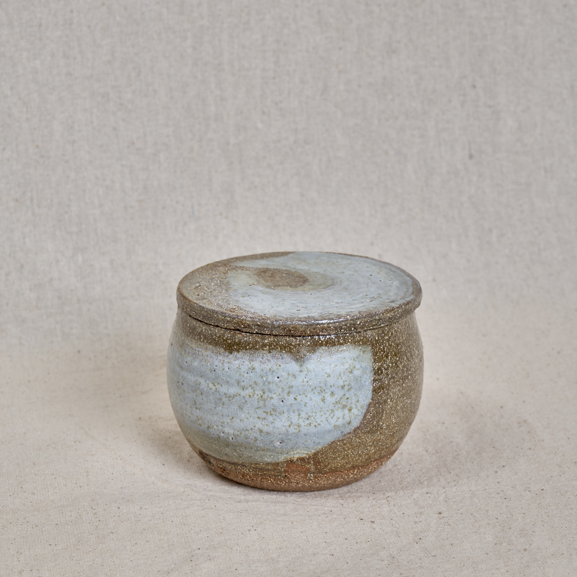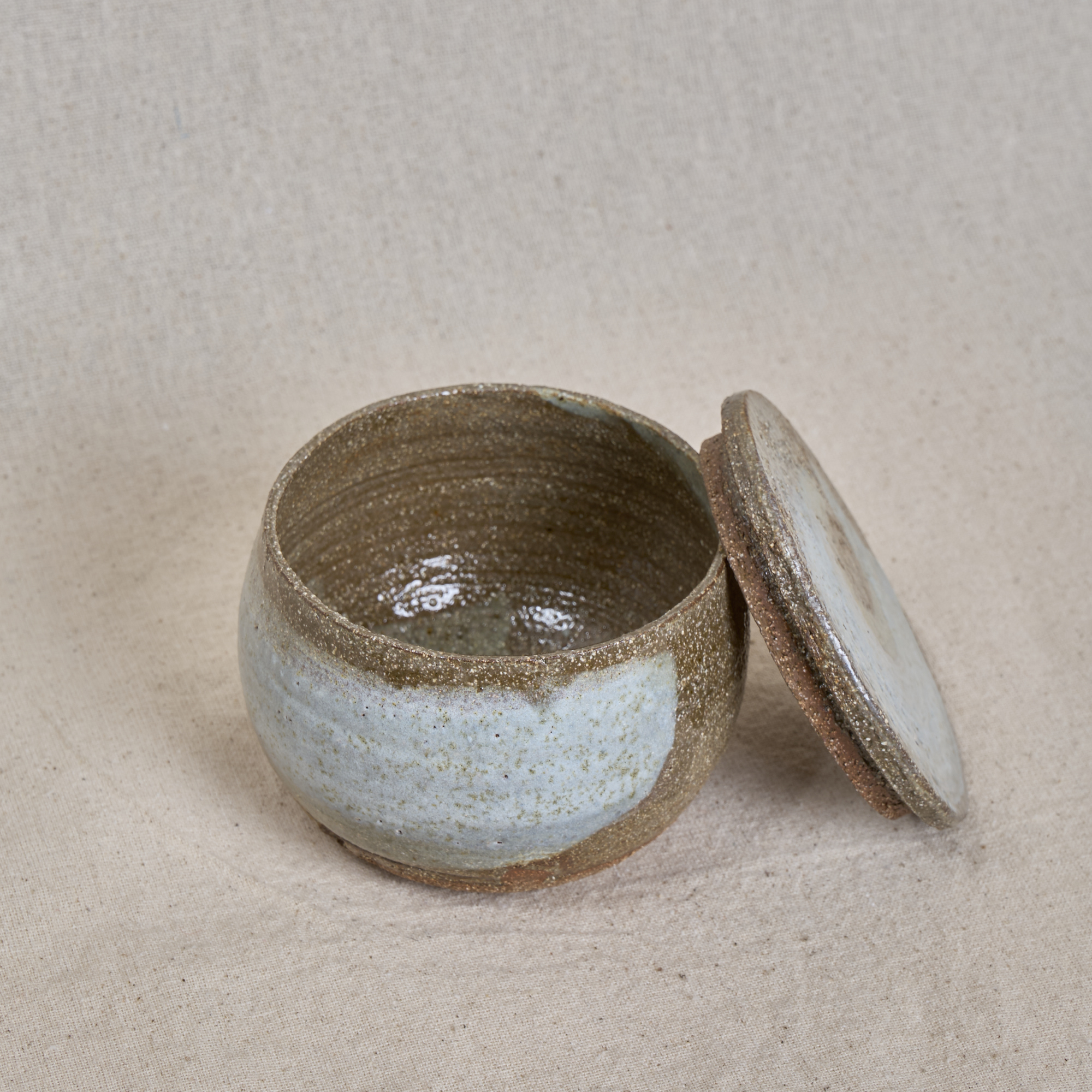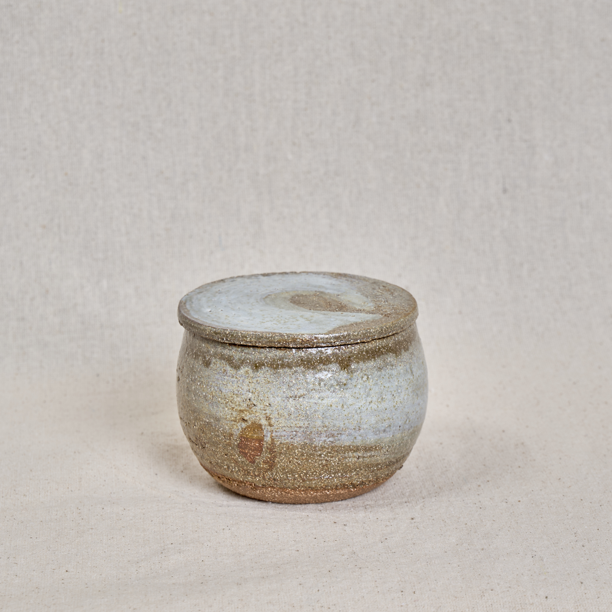 A small hand-thrown stoneware box with lid, made in pink grog clay and finished with natural ash-like glazing. A tactile piece for storing small everyday objects.