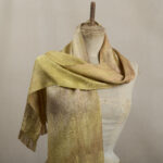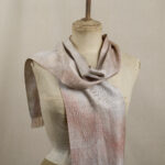 Each scarf is hand-painted to minimise water and dye waste, then woven without electricity. The process is slow and precise, giving the fabric its refined character and soft drape.
