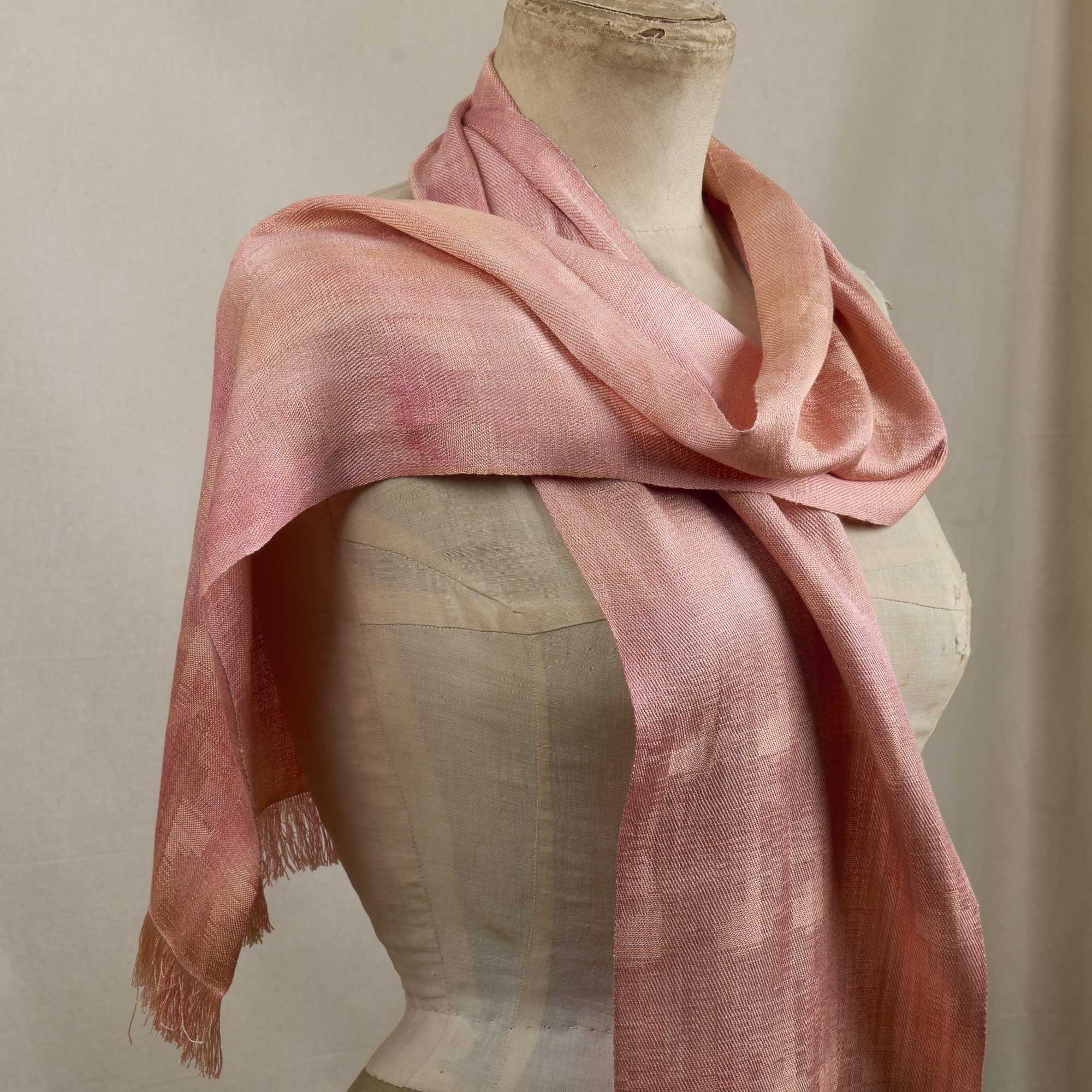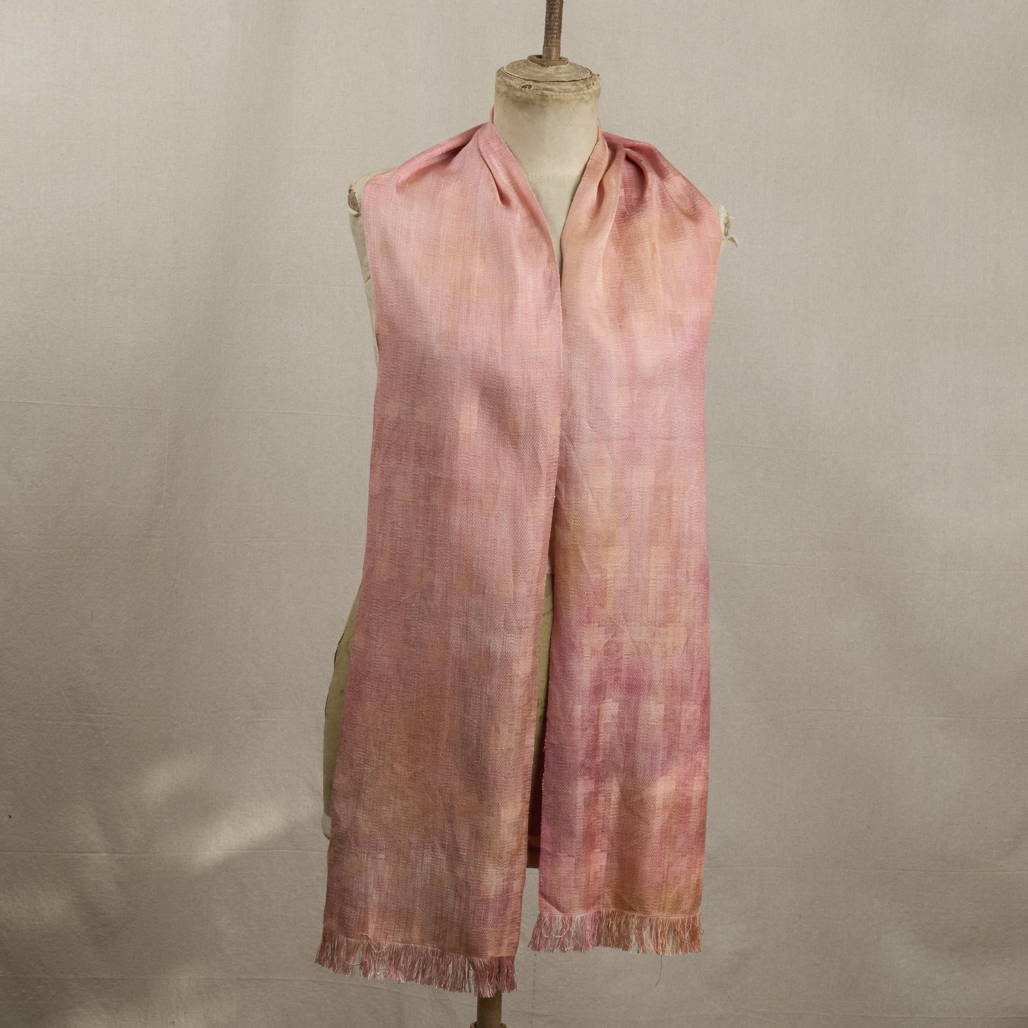A soft, luminous silk scarf inspired by the early light over Glasgow. Hand dyed in warm coral and blush tones, and woven using a subtle damask structure, it captures the quiet glow of sunrise across the city.